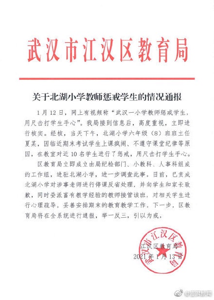 1月12日,湖北武汉,网上一则#小学生排队被老师竹板打手#的视频,引发关注。13日,江汉教育通报称,经核实,当天下午,北湖小学六年级(8)班班主任夏某,因临近期末考试学生上课疯闹、不遵守课堂纪律等原因,在教室对近10名学生进行了惩戒,用尺击打学生手心。目前,责成涉事老师停课反省,并向学生和家长致歉。对此,你怎么看呢?